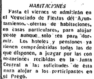 «Alojar gente aunque solo sea para dormir». Con el propósito de «alojar a los participantes en el Pregó», el Negociado de Fiestas del Ayuntamiento de Castellón se abre a recibir «ofertas de habitaciones en casas particulares» en febrero de 1951, a solo cinco días de la Romeria de les Canyes. Según recoge Mediterráneo, el motivo de tal búsqueda es que los hoteles y pensiones de la ciudad «ya tienen comprometidas todas las de que disponen, a juzgar por las contestaciones recibidas en la Junta Central a las solicitudes de ésta».