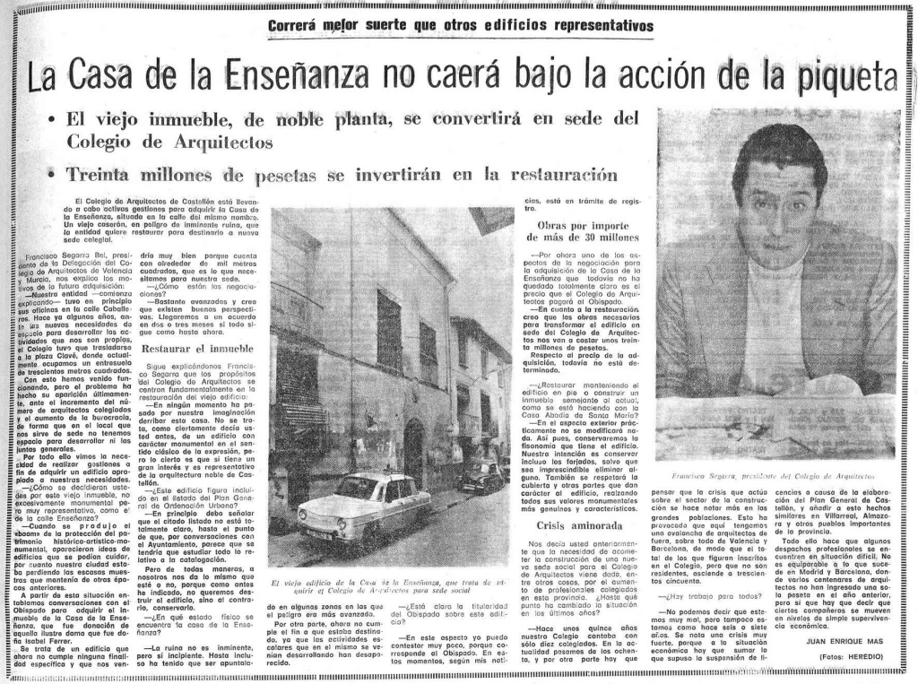 En 1981, apenas dos días antes del golpe de Estado del 23F, Mediterráneo informa sobre la inminente adquisición por parte de la delegación castellonense del Colegio de Arquitectos de Valencia y Murcia, de la Casa de la Enseñanza, antiguo palacio de la familia de Isabel Ferrer y sede de su escuela de niñas. Francisco Segarra Bel, presidente de la delegación, explica a Juan Enrique Mas que se invertirán 30 millones de pesetas en la restauración del inmueble, que «no caerá bajo la acción de la piqueta», mereciendo así «mejor suerte que otros edificios representativos».