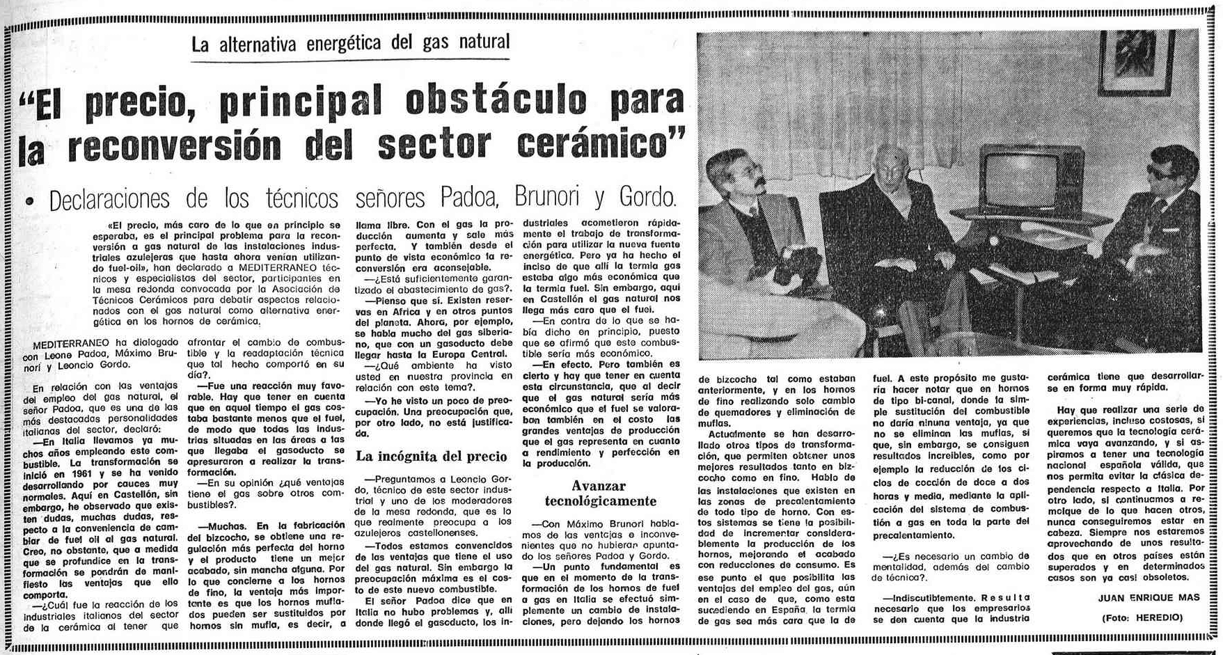 A finales de febrero de 1981, apenas ocho meses después de la llegada del gas natural a la industria cerámica, la Asociación Española de Técnicos Cerámicos (ATC) organiza una mesa redonda sobre el gas «como alternativa energética en los hornos de cerámica». Con ocasión de este debate, Juan Enrique Mas charla para Mediterráneo con los tres expertos participantes en el encuentro: Leone Padoa, Massimo Brunori y Leoncio Gordo. La principal conclusión que extrae el periódico es que el «principal obstáculo» para la reconversión a la nueva fuente de energía en el sector es el precio.