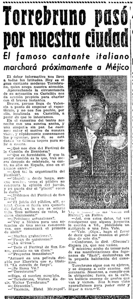Tres días después de la Romeria de les Canyes de 1961, Rocco Walter Torrebruno Orgini, más conocido por su primer apellido, es entrevistado por Mediterráneo con ocasión de su paso por Castellón. Instalado en España como cantante desde tres años antes, con el tiempo alcanzará su máxima popularidad como presentador televisivo y autor de célebres canciones infantiles.