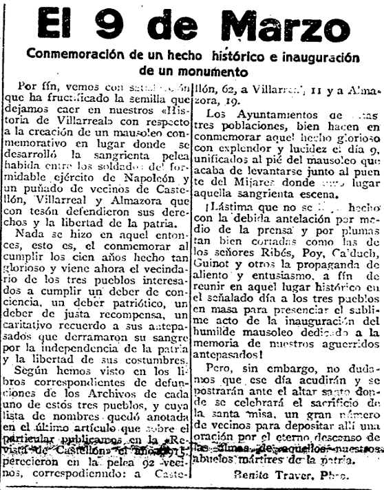La «conmemoración de un hecho histórico» adquiere protagonismo en marzo de 1926 en Diario de Castellón con la inauguración de un monumento -un monolito- para conmemorar un hecho bélico en el que perdieron la vida, en el puente del Millars, decenas de vecinos de la Plana, en plena Guerra de la Independencia contra los franceses. La resistencia ante el avance del ejército de Napoleón causó, según recoge el periódico, a 62 habitantes de la capital, 19 de Almassora y 11 de Vila-real.