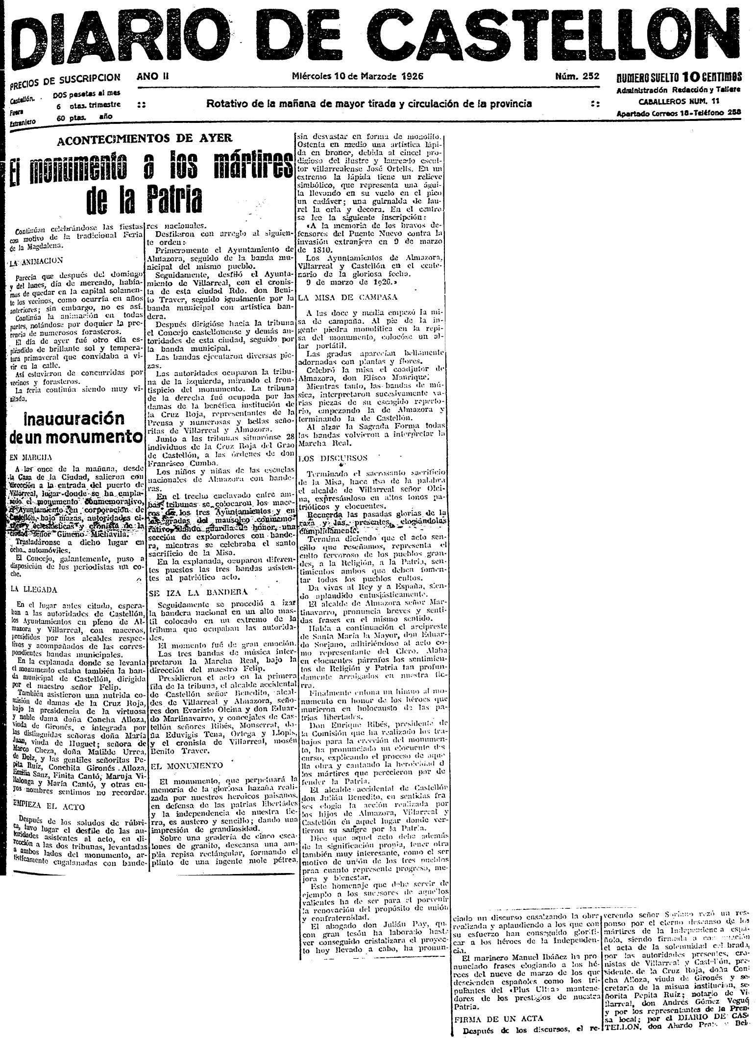 Al día siguiente, miércoles 10 de marzo, se recogen los actos del acto de inauguración del monumento en honor de «los mártires de la patria» -obra del escultor José Ortells-, discursos incluidos.