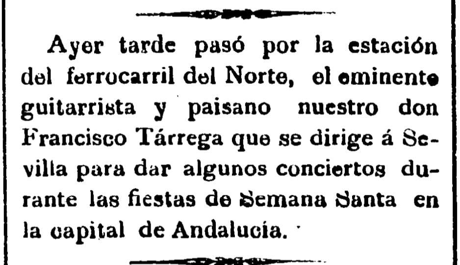 A comienzos de 1896, el guitarrista Francisco Tárrega tiene 43 años y lleva años consagrado como «eminente» en su profesión, de acuerdo con el adjetivo que le dedica Heraldo de Castellón en esta noticia breve. En ella, el diario da cuenta de su paso por la capital de la Plana -en concreto por la estación del Norte y probablemente procedente de Barcelona, camino de Sevilla «para dar algunos conciertos durante las fiestas de Semana Santa».