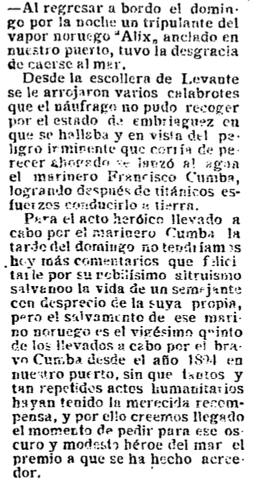 El marinero del Grao Francisco Cumba protagoniza varias noticias a mediados de marzo de 1921 por haber salvado a un tripulante de un vapor noruego anclado en el Puerto de Castellón. «En vista del peligro inminente que corría» -entre otras cosas por su «estado de embriaguez»- Cumba logra rescatarlo «después de titánicos esfuerzos» en un acto que Heraldo de Castellón califica de «heroico». Pero no es un salvamento más, sino que según el diario, «es el vigésimo quinto de los llevados a cabo por el bravo Cumba desde el año 1894 en nuestro puerto, sin que tantos y tan repetidos actos humanitarios hayan tenido la merecida recompensa», por lo que pide algún reconocimiento «para ese oscuro y modesto héroe del mar».