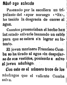 Por su parte, La Provincia Nueva también recoge la noticia con emnos detalles y señala que «el joven marinero» Cumba ha salvado hasta el momento a 13 náufragos. Las cifras, por tanto, difieren según el periódico consultado, pero no así los elogios al «valiente» marinero: