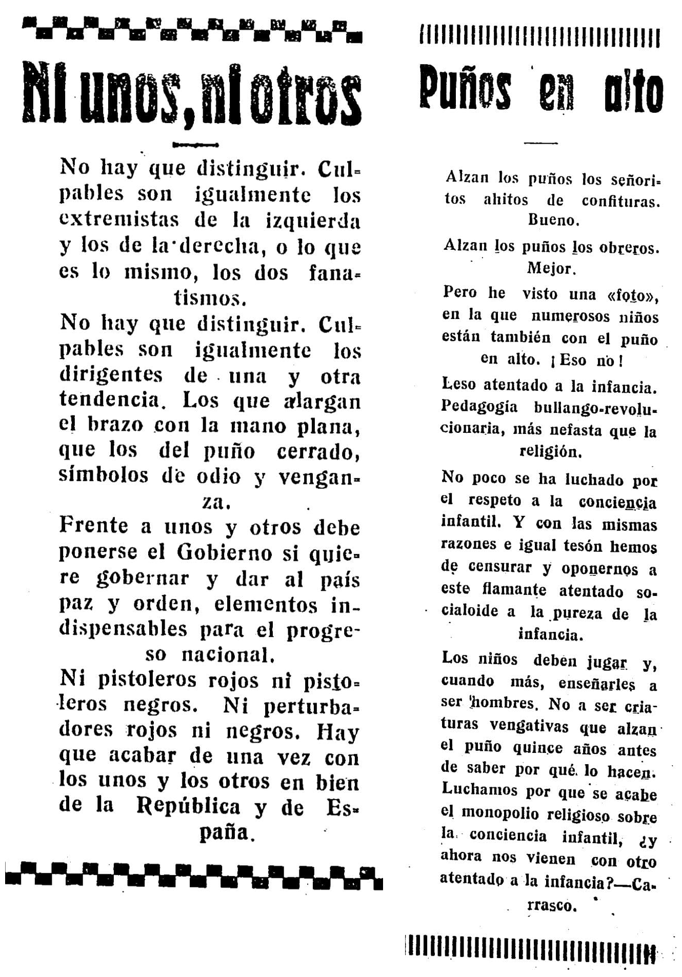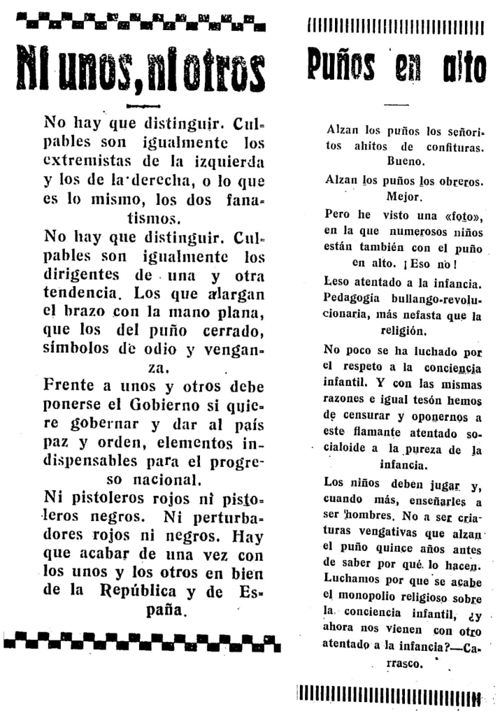 En otra columna firmada por Carrasco, se muestra en contra de una imagen «en la que numerosos niños están también con el puño en alto» y se posiciona contra «este flamante atentado socialoide a la pureza de la infancia», para concluir con una pregunta lanzada al aire: «luchamos por que se acabe el monopolio religioso sobre la conciencia infantil, ¿y ahora nos vienen con otro atentado a la infancia?».