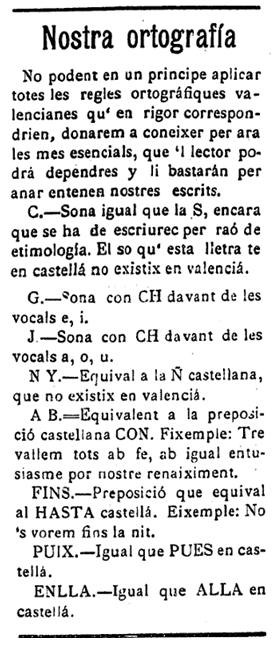En su primer número, el semanario valencianista dedica un espacio a dar a conocer las reglas ortográficas «que’l lector podrà dependres y li bastaran per anar entenen nostres escrits«: