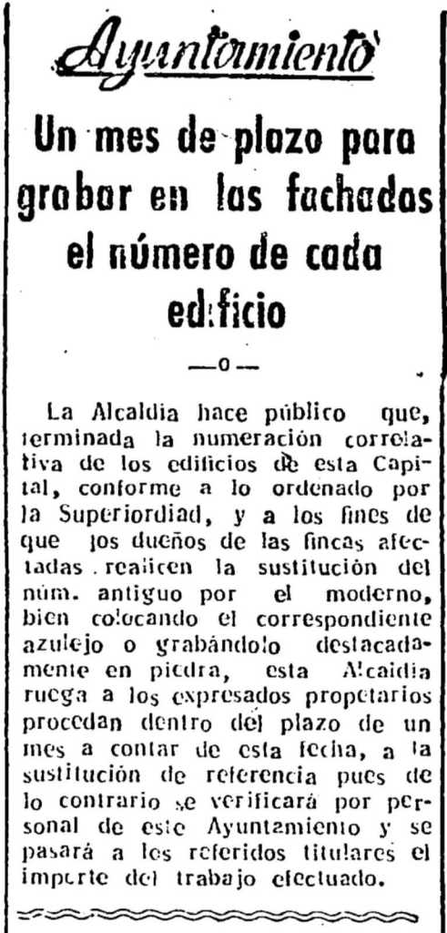 «Terminada la numeración correlativa de los edificios de esta Capital», el alcalde Carlos Fabra Andreu pide a través de Mediterráneo a los «dueños de las fincas afectadas» que realicen «la sustitución del núm. antiguo por el moderno, bien colocando el correspondiente azulejo o grabándolo destacadamente en piedra». Se pide a los propietarios «procedan en el plazo de un mes a contar de esta fecha», puesto que en caso contrario, «se verificará por personal de este Ayuntamiento» y se les pasará la correspondiente factura por el trabajo efectuado.