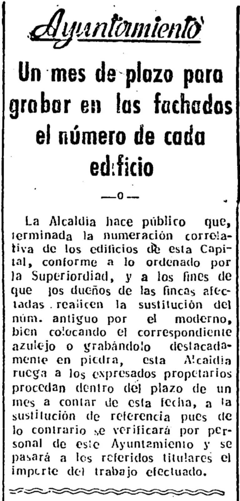 «Terminada la numeración correlativa de los edificios de esta Capital», el alcalde Carlos Fabra Andreu pide a través de Mediterráneo a los «dueños de las fincas afectadas» que realicen «la sustitución del núm. antiguo por el moderno, bien colocando el correspondiente azulejo o grabándolo destacadamente en piedra». Se pide a los propietarios «procedan en el plazo de un mes a contar de esta fecha», puesto que en caso contrario, «se verificará por personal de este Ayuntamiento» y se les pasará la correspondiente factura por el trabajo efectuado.