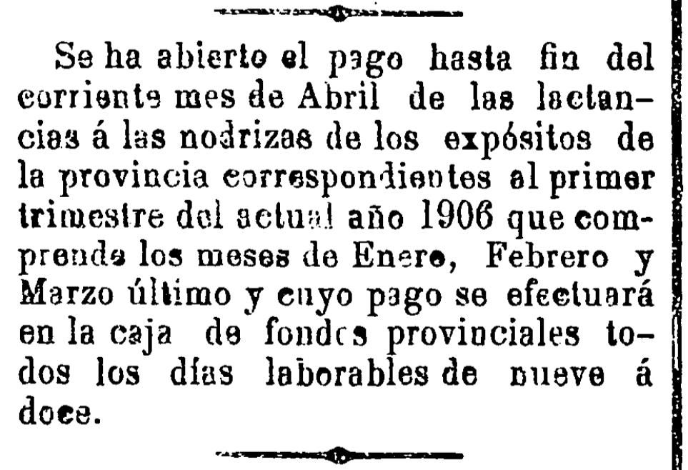 El pago de lactancias «a las nodrizas de los expósitos de la provincia» del primer trimestre de 1906 ocupa este breve de Heraldo de Castellón a comienzos de abril. El abono de los importes debidos a estas mujeres se realiza «en la caja de fondos provinciales» hasta fin de mes.