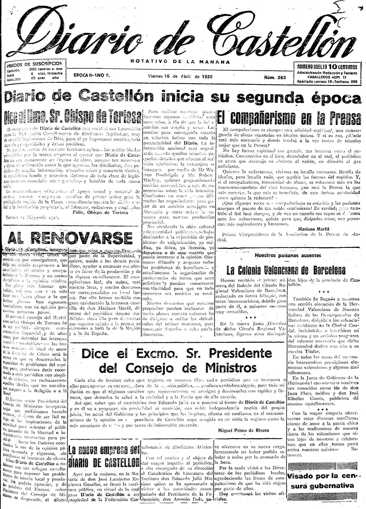 El viernes 16 de abril de 1926 es un día importante en la historia de Diario de Castellón, cuyo primer ejemplar se había publicado el 15 de mayo del año anterior. El periódico cambia de manos y pasa de las de su fundador, Jaime Chicharro, a la Federación Castellonense de Sindicatos Agrícolas. Cambia la tipografía de su cabecera como símbolo del arranque de su «segunda época», y su portada incorpora incluso un artículo del dictador Miguel Primo de Rivera, presidente del Consejo de Ministros, quien felicita al nuevo director del periódico, el valenciano Eduardo Juliá Martínez.
