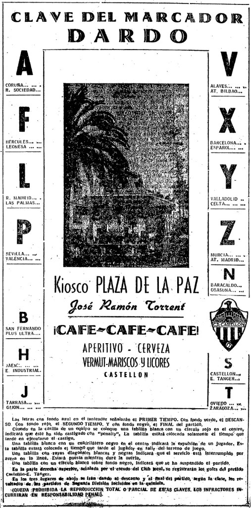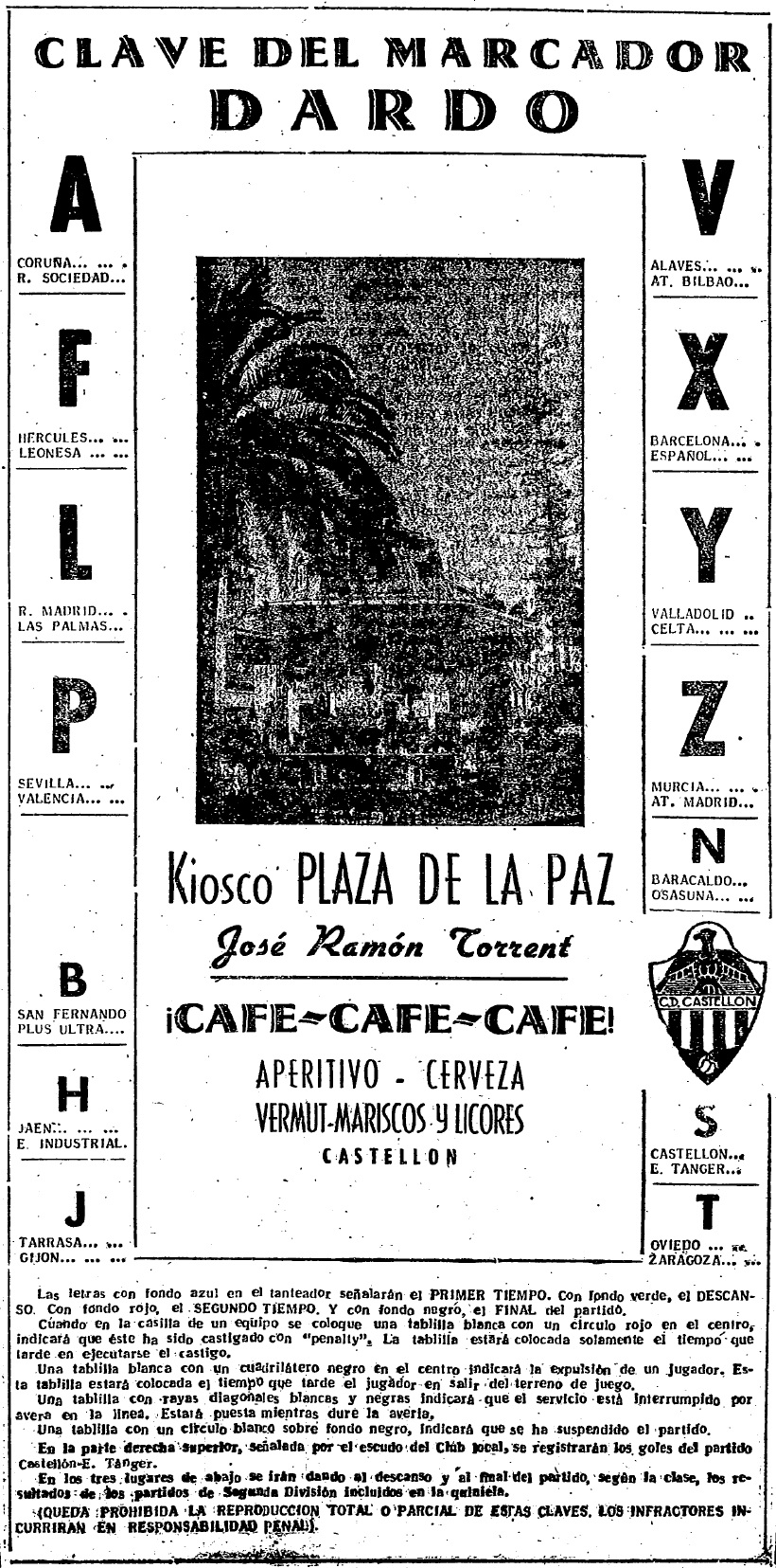El domingo 15 de abril de 1956 encontramos en Mediterráneo las «claves del marcador Dardo» para el estadio Castalia de la jornada que se disputaría ese mismo día, con el CD Castellón – España de Tánger entre los partidos destacados. En este caso, en lugar de un anunciante, las claves que identifican los partidos son letras, y quien las publicita es el quiosco de la plaza de la Paz, regentado por José Ramón Torrent. Al pie, se explican las formas de leer las señales del marcador: las letras con fondo azul señalarán el primer tiempo de los partidos, en verde se indicará el el descanso y en rojo, el segundo tiempo. El negro se reserva para el final de los partidos. Asimismo, una tablilla blanca con un círculo rojo indicará que al equipo indicado se le ha castigado con un penalti, otra con un «cuadrilátero» negro serviría para avisar de una expulsión… y así incluso la previsión de una tablilla «con rayas diagonales blancas y negras» que indicaría «que el servicio está interrumpido por avería en la línea».