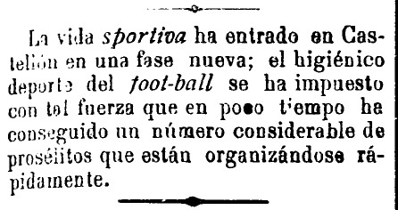 A mediados de abril de 1906, Heraldo de Castellón informa de cómo «la vida sportiva» entra en una nueva fase en la ciudad, porque «el higiénico deporte del foot-ball se ha impuesto con tal fuerza que en poco tiempo ha conseguido un número considerable de prosélitos».