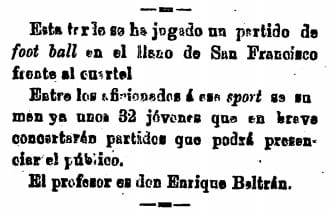 Dos meses antes, el martes 13 de febrero del mismo año, había recogido La Provincia uno de los primeros testimonios de la práctica del fútbol en la ciudad. Se trata de la celebración de un partido en el llano de San Francisco y «frente al cuartel», contabilizando el periódico a «unos 32 jóvenes» entre los aficionados a tan novedoso deporte.