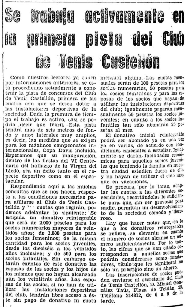 El 20 de mayo de 1966, de acuerdo con la página web del Club de Tenis Castellón, «se firma la escritura de compra de los terrenos, en el Camino de la Donación, en los que se asentaría el futuro Club». No obstante, un mes antes Mediterráneo informa sobre cómo «se trabaja activamente» en la construcción de la primera pista, «primera de las cuatro» inicialmente planeadas.