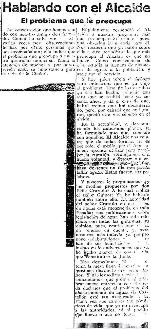 En abril de 1926, el alcalde de la capital de la Plana, Salvador Guinot, conversa con un reportero de Diario de Castellón sobre «el problema que preocupa a nuestra autoridad municipal». Aunque realmente «más que preocupación resulta (…) una obsesión»: lo que más preocupa al alcalde «es que no llueve» y como consecuencia, «estudia la manera de abastecer de aguas a la población y asegurar el servicio». El problema es viejo y de hecho «uno de los estudios que se han hecho coincide con otro que se realizó hace ya sesenta años».
