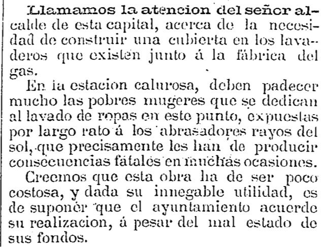 Los motivos de la petición son claros: «en la estación calurosa, deben padecer mucho las pobres mugeres que se dedican al lavado de ropas en este punto, expuestas por largo rato a los abrasadores rayos del sol», avisando sobre las «consecuencias fatales» que se producen «en muchas ocasiones». Los lavaderos serán finalmente derribados medio siglo después, el 14 de junio de 1925, según recuerda José Luis Gimeno en este artículo.