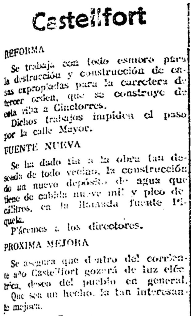 Diario de Castellón informa en abril de 1926 de varias mejoras en el pueblo de Castellfort. Por un lado, de una «reforma» en la que se trabaja «con todo esmero» a través de la «destrucción y construcción» de casas expropiadas al objeto de crear la nueva carretera entre la localidad y Cinctorres. Por otra parte, la culminación de un flamante depósito de aguas con capacidad para «nueve mil y pico decálitros» en la «llamada Fuente Piqueta». Y como colofón, la expectativa de una próxima llegada de la luz eléctrica al municipio, promesa que «se asegura» para «dentro del corriente año».
