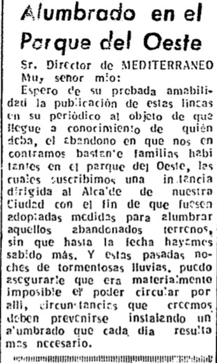 El último jueves de abril de 1951, una carta dirigida al director de Mediterráneo, Jaime Nos, denunciaba «el abandono» que sienten «bastantes familias habitantes en el Parque del Oeste», que un tiempo atrás habían solicitado al alcalde de la ciudad, Carlos Fabra Andrés, la adopción de medidas «para alumbrar aquellos abandonados terrenos, sin que hasta la fecha hayamos sabido más».
