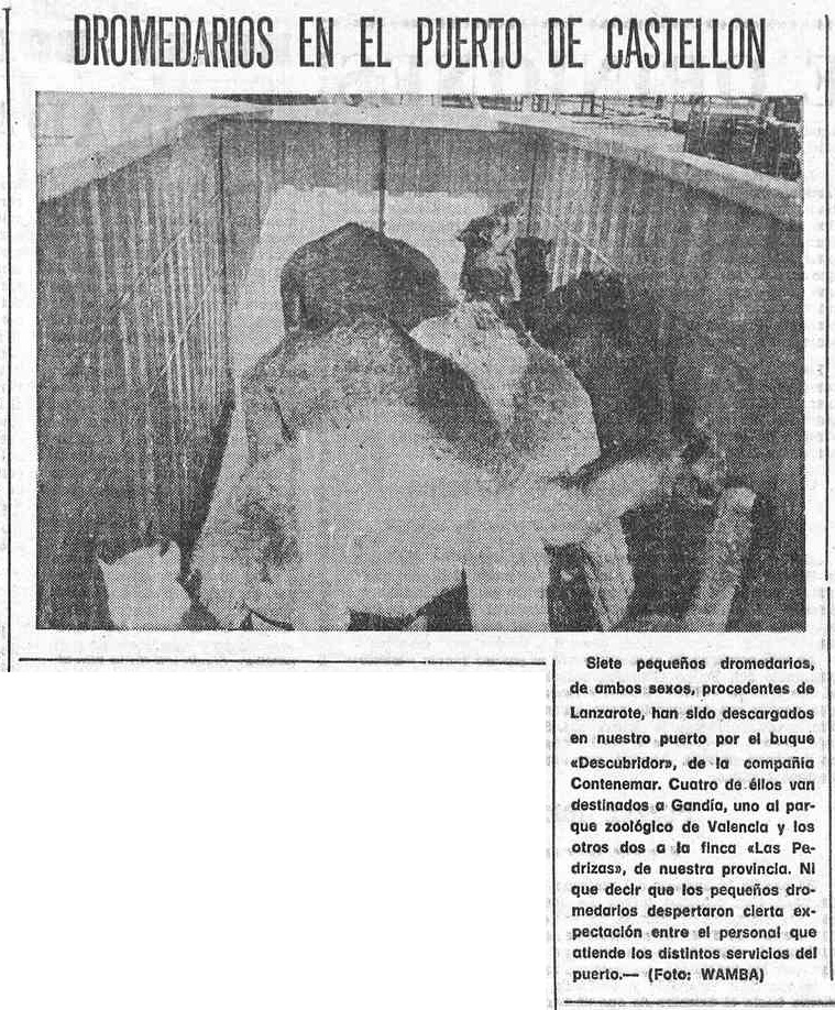 El último sábado de abril de 1976, los lectores de Mediterráneo se ven sorprendidos por una fotonoticia -con imagen de Wamba– con un titular más que peculiar: «Dromedarios en el Puerto de Castellón«. En el pie de foto se explica que se trata de «siete pequeños dromedarios, de ambos sexos» que han sido descargados por el buque Descubridor de la empresa Contenemar, y que han despertado gran expectación entre el personal portuario. Sus destinos son dispares: cuatro se trasladarán a Gandia, uno al zoo de Valencia y otros dos a la ondense finca de Las Pedrizas.