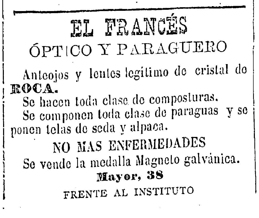 En El Clamor de Castellón se anunciaba de esta forma un negocio más que curioso en la ciudad de 1889. En la calle Mayor 38 y frente al instituto provincial, entonces situado en la actual plaza Santa Clara, El Francés ofrecía sus servicios como «óptico y paragüero», incluyendo en el reclamo «anteojos y lentes legítimo de cristal de Roca», pero también advirtiendo que en el comercio se componían «toda clase de paraguas», poniéndoles «telas de seda y alpaca». Como guinda de este heterogéneo pastel, se prometía ahuyentar las enfermedades con una «medalla Magneto galvánica».
