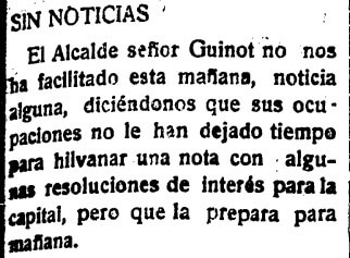 Salvador Guinot Vilar es alcalde de la capital de la Plana en dos ocasiones -en 1907 y entre 1925 y 1927- y además de político, en su faceta intelectual destaca como primer presidente de la Societat Castellonenca de Cultura (SCC) en 1920. En los inicios de su segunda etapa con la vara de mando, este breve de La Provincia Nueva pone de relieve lo limitado de los medios del Ayuntamiento de Castellón del momento. El redactor del diario dice que el alcalde no ha facilitado a la prensa «noticia alguna», y Guinot se excusa porque sus ocupaciones «no le han dejado tiempo para hilvanar una nota con algunas resoluciones de interés para la capital», si bien promete hacerlo para el día siguiente: